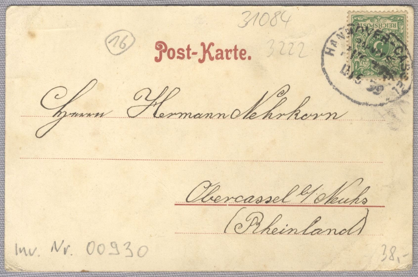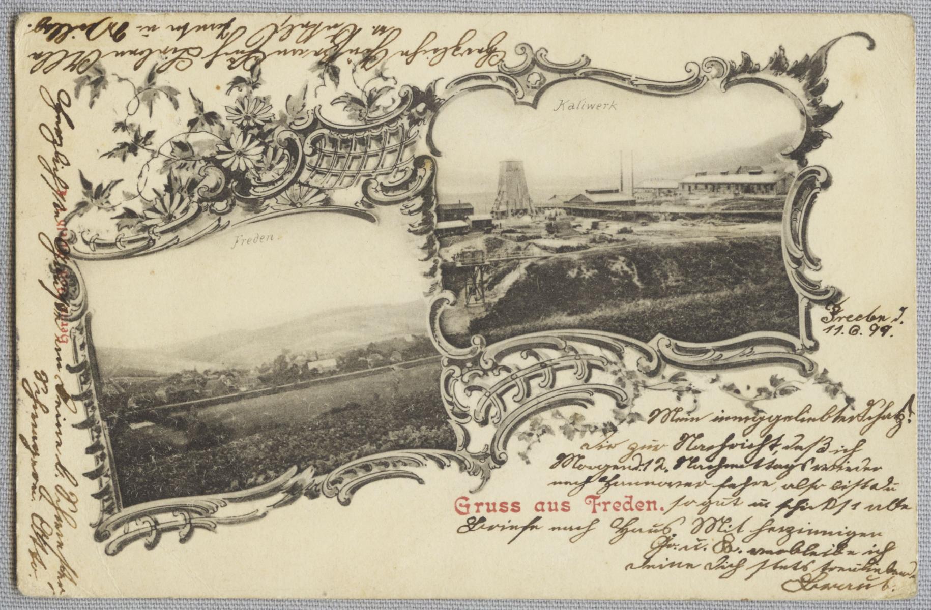 Die am 11.06.1899 verschickte Ansichtskarte zeigt eine Ortsansicht von Freden an der Leine in Niedersachsen. Leider sind auf der Ortsansicht nur wenige Details zu erkennen. Eine zweites Bild zeigt das im Bau befindliche Kaliwerk Hohenzollern. Beide Bildmotive sind von einem reichen, teilweise mit mit Blumen aufwendig grafisch gestalteten Rahmen umgeben. Der Schacht des Kaliwerks wird gerade abgeteuft, was am aus Holz errichteten Abteufturm in der linken oberen Ecke zu erkennen ist. Denmach muss die Aufnahme des Kaliwerks zwischen Oktober 1896 und 1898, dem Jahr seiner Fertigstellung entstanden sein. Nach der Fertigstellung hat er eine Teufe von 720 m. Auf der rechten Seite sind verschiedene flache Gebäude zu sehen, die wahrscheinlich bereits für die zukünfitige Kalifabrik errichtet worden sind. Durch den Vordergrund zieht sich von rechts nach links ein Damm, der anscheinend in einer Abwurfstelle endet. Möglicherweise werden hier die beim Schachtbau anfallenden Gesteinsmassen abgelagert. Das Kaliwerk Hohenzollern ist im Jahr 1925 außer Betrieb genommen worden.