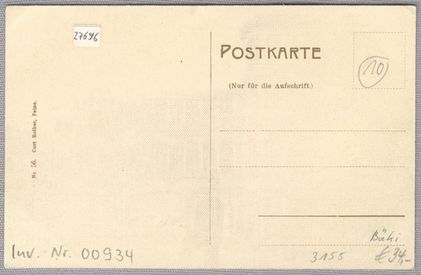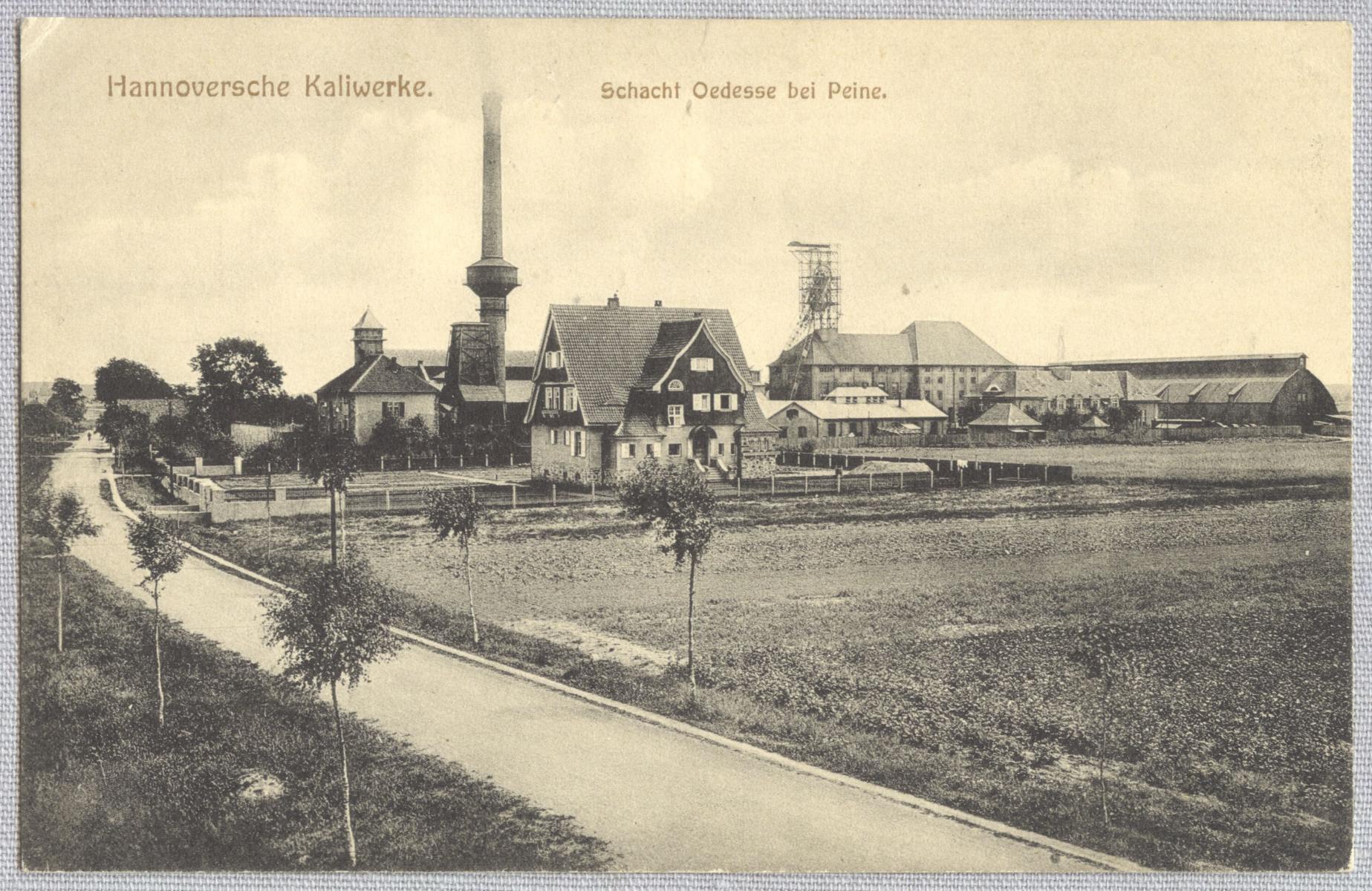 Der Schacht Oedesse in der Gemeinde Edemissen in Niedersachsen war der Produktionsstandort der Hannoverschen Kaliwerke. Zwischen April 1905 und 1912 wurde der 905 Meter tiefe Schacht Oedesse abgeteuft. Das Kaliwerk begann im Jahr im Jahr 1913 mit seiner Produktion, die bereits in Jahr 1926 eingestellt wurde. Danach wurde der Schacht anschließend als Reservebergwerk in einem betriebsfähigen Zustand gehalten. Diese Phase endete am 12. August 1936, als es zu einem katastrophalen Wassereinbruch kam und das Bergwerk binnen eines Tages komplett abgesoffen ist. Weitere Informationen: https://de.wikipedia.org/wiki/Hannoversche_Kaliwerke Auf der Ansichtskarte führt eine augenscheinlich neue, gut ausgebaute und von Bäumen gesäumte Straße zum rechts von ihr gelegenen Kaliwerk. Zum Werksgelände gehört zuerst ein großes Gebäude, entweder ein Wohngebäude für höhere Angestellte oder wahrscheinlicher die Verwaltung des Werkes. Links davon ein Gebäude mit Pyramidendach, bei dem es sich wohl um den Werkseingang handeln dürfte. Auffällig ist der hohe Schornstein des Kesselhauses, an dem ein Wasserhochbehälter angebracht ist. Es schließen sich das Fördergerüst mit Schachthalle und einer direkt angebauten Rohsalzmühle oder dem Lösehaus an. Das Werksgelände der Kalifabrik endet schließlich mit einem langgestreckten Lagerschuppen.