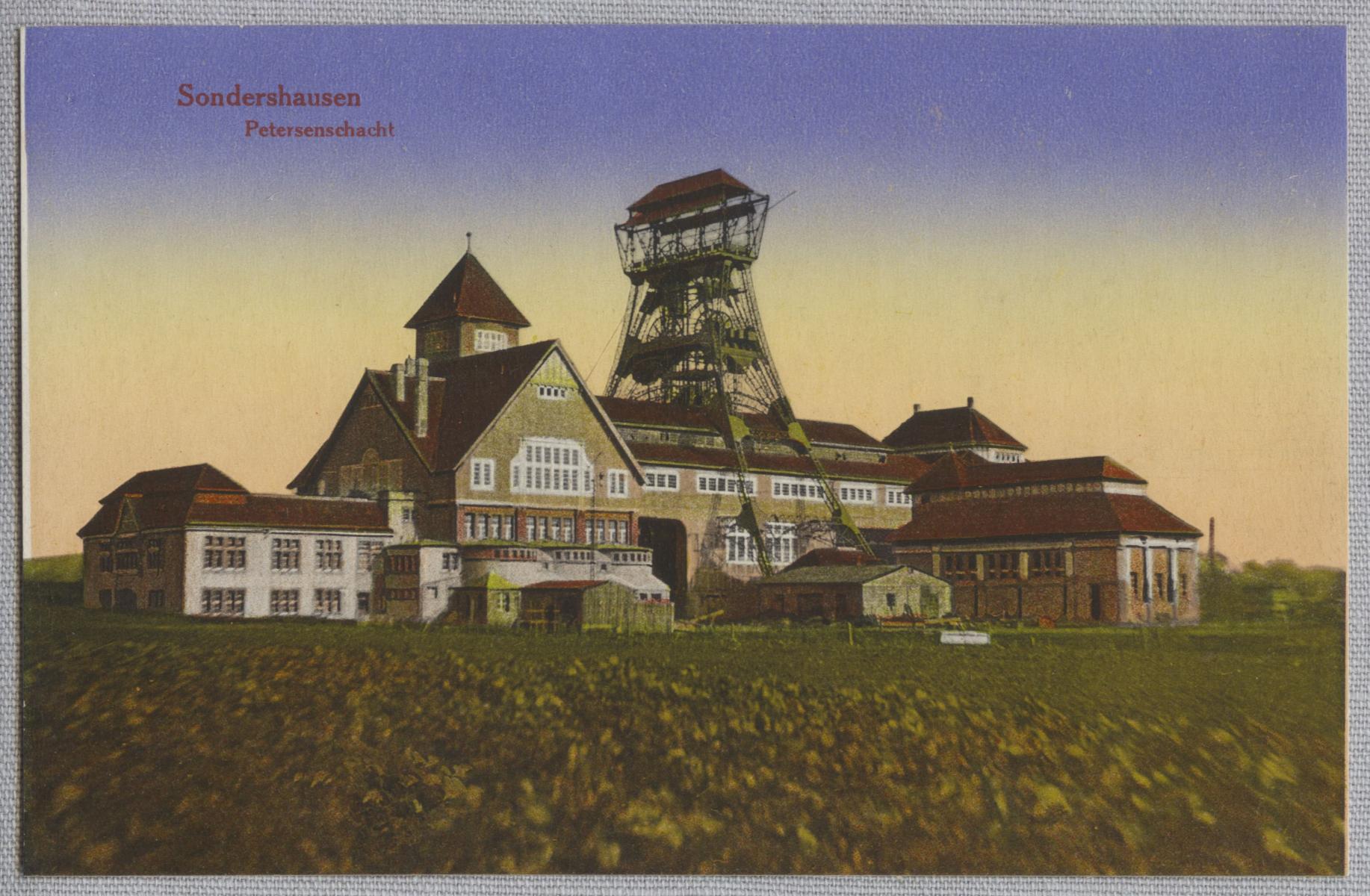 Ansicht des Petersenschachtes in Sondershausen. Auffällig ist das aufwendig gestaltete und bis heute als technisches Denkmal erhaltene Schachtfördergerüst